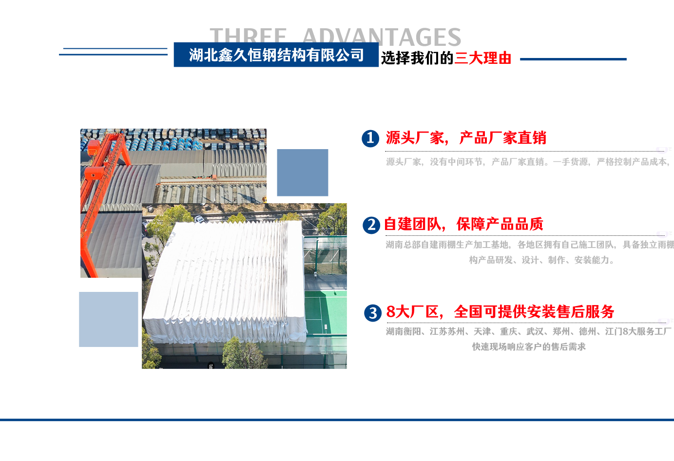湖北鑫久恒鋼結構有限公司是一家電動雨棚、膜結構車棚研發,生產銷售,施工安裝于一體的專業鋼結構科技公司,主要產品有伸縮雨棚,電動雨棚,膜結構車棚等?! 『系貐^職員目前有80多人,占地面積20000平方米,廠房面積15600平方米,配備先進的生產流水線,使每件品質產品的堅實基礎?! 」驹谔K州、天津、重慶、武漢、德州、烏魯木齊、江門均設有服務工廠,總人員共300多人,擁有專業的技術團隊,配備先進的設備和流水線生產,產能高,貨源充足,發貨速度快,服務區域廣?! ∫苿由炜s棚適用于通道臨時倉儲、戶外運動遮陽、污水池遮蓋、能源交通、熱力化工、礦山、船舶制造及市政建設、物流、碼頭等領域的構件制作加工,成品半成品存放、倉庫、野外儀器設備操作用房等。尤其是對工廠發貨、倉儲臨時遮雨防嗮,梅雨期較長、建設周期較短的工程施工等特別適用。還可根據用戶需求量身定制、適合企業所需不同款式的產品?! ∥夜緢猿帧罢\信社會為本,客戶滿意為榮”的經營理念,做到質量把控,嚴格管理,精益求精,恪守承諾。使鑫久恒逐步走向成熟,其系統化、專業化日趨完善。以專業的技術、科學的管理,更高的產品質量,優良的企業信譽,真誠的客戶服務,靈活多樣的經營方式和務實創新的企業精神愿與社會各界攜手合作,為推動智能鋼結構建筑事業的發展而不斷努力。...